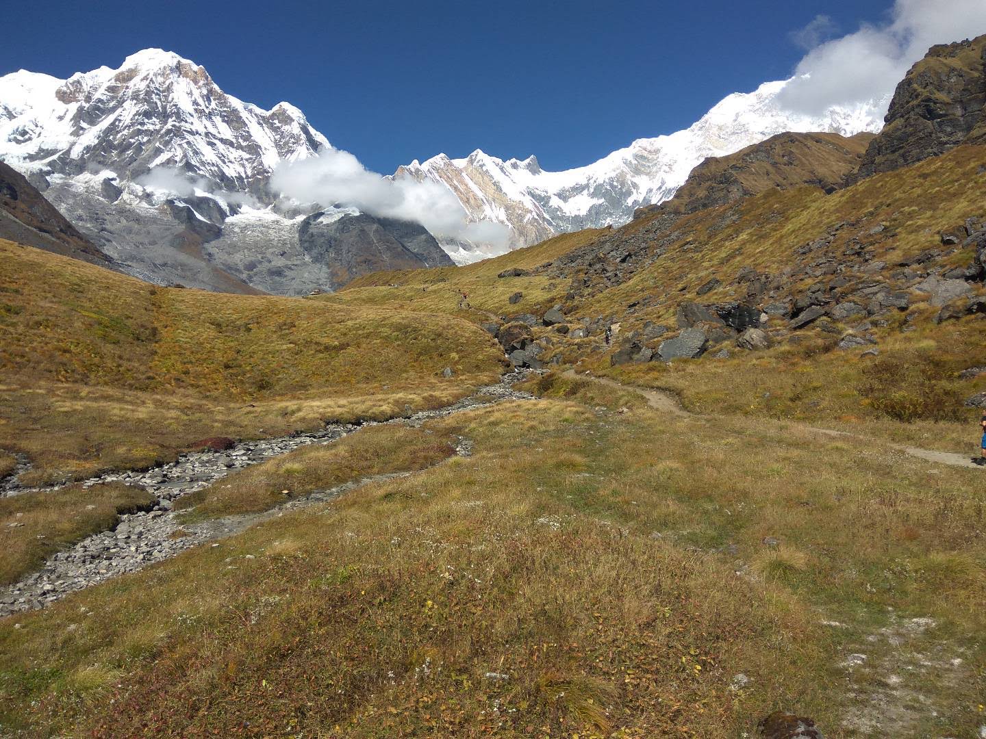 The Luxury Annapurna Base Camp Trek (14 Days) starts with Trek between Annapurna Base Camp (4,130m) and Bamboo (2,310m) where the trekkers get the opportunity to see the high mountain scenery in a new perspective. You will begin your descent through alpine meadows and rocky paths after an early breakfast of about 6.30-7.00 AM, at your lodge in your lodge in the ABC. It reaches Machhapuchhre Base Camp (3,700m) once more to take optional photos and a brief rest, and proceeds through rhododendron and bamboo forests with varying vegetation and breathtaking sight of Annapurna South and Hiunchuli. At around 10:30 AM there is typically a mid-morning break to rest and take in the scenery.